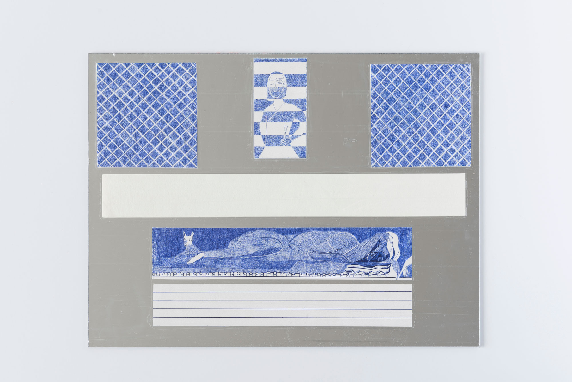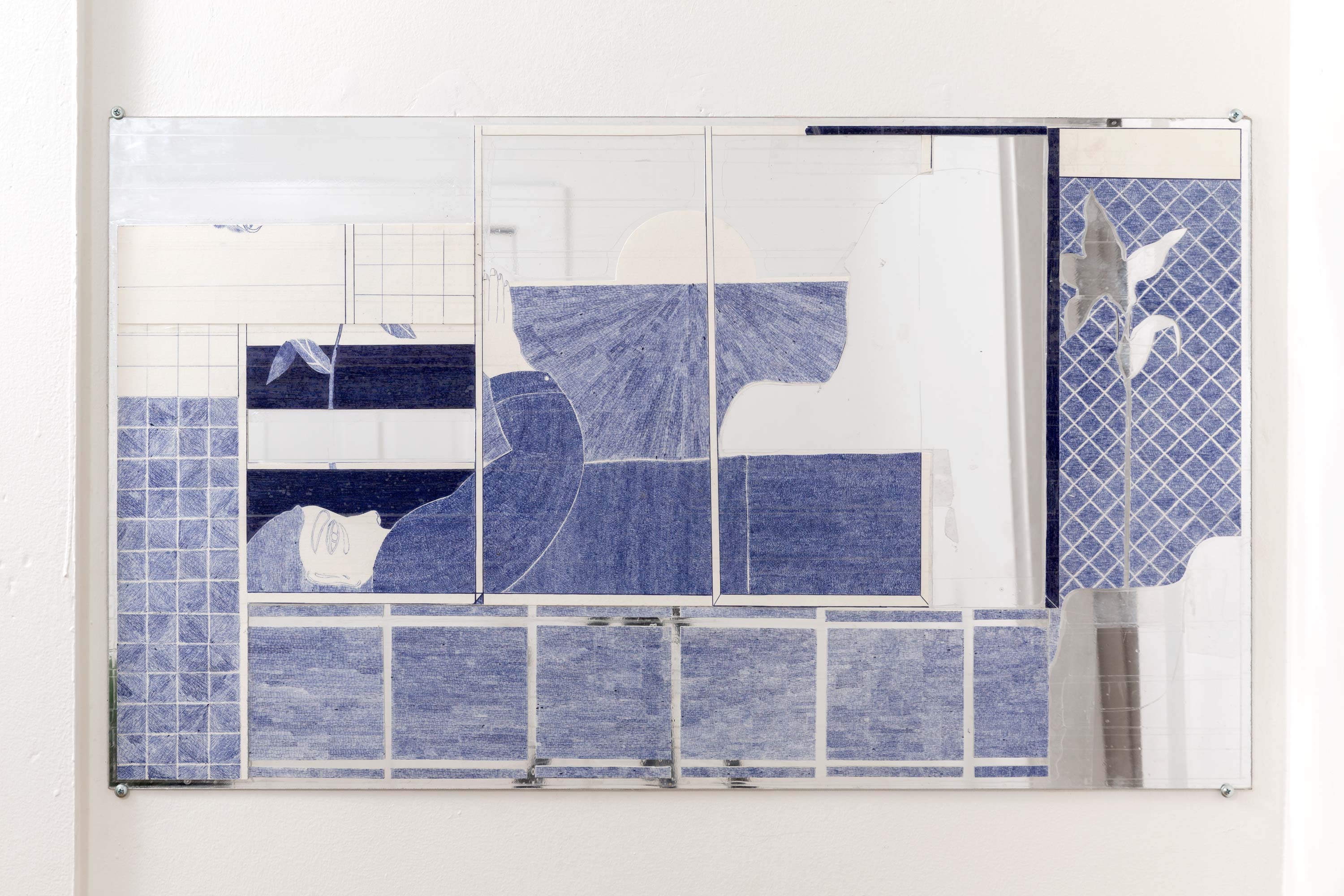 I could - eventually, Ballpoint Pen on Paper, Clear Packing Tape, Acrylic Mirror, 13.5” x 18”, 2018