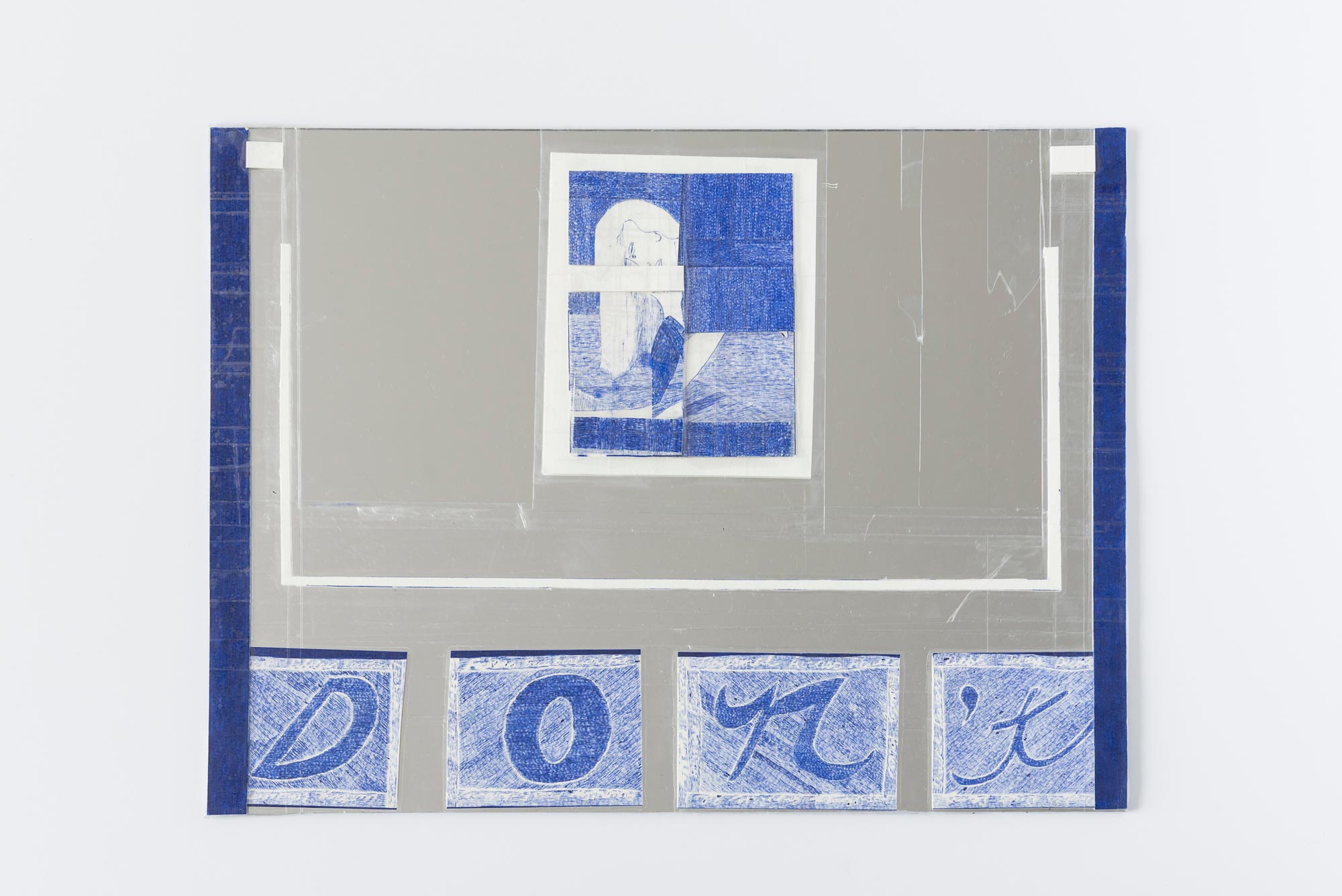 Don’t, Ballpoint Pen on Paper, Clear Packing Tape, Acrylic Mirror, 13.5” x 18”, 2018