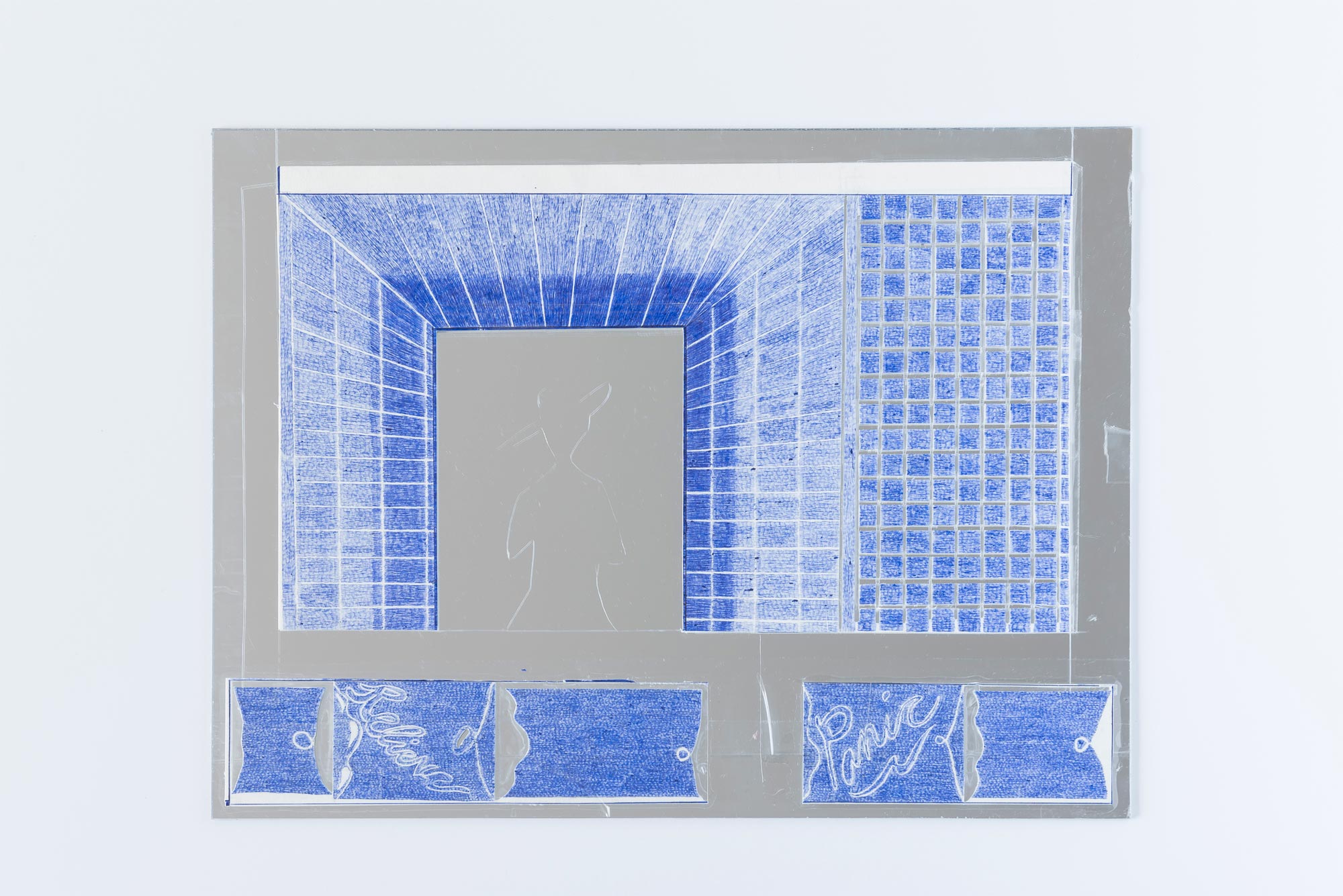 Relieve and Panic, degree and shame, Ballpoint Pen on Paper, Clear Packing Tape, Acrylic Mirror, 13.5” x 18”, 2018